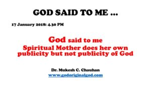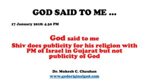God said something this afternoon around 4.30 pm today which shocked me. Then again this is what I have been telling mankind on Earth that true God’s name is covered up by powerful energies who are doing their utmost to promote their now name and fame. Nobody loves God for what God is. What world does not know is that their are selfish reasons for which others are undertaking publicity of religions. For instance, World spiritual Father Shiv comes under criticism as he is promoting PM of Israel in Gujarat India with PM Modi – for their selfish name of religions. No one is doing publicity of true God who is covered up on Earth and in worship…Spiritual Mother is also doing her own selfish publicity. Nobody cares for God to inform the truth to human beings who are ignorant about God. God said that is why I was destroyed on Earth.